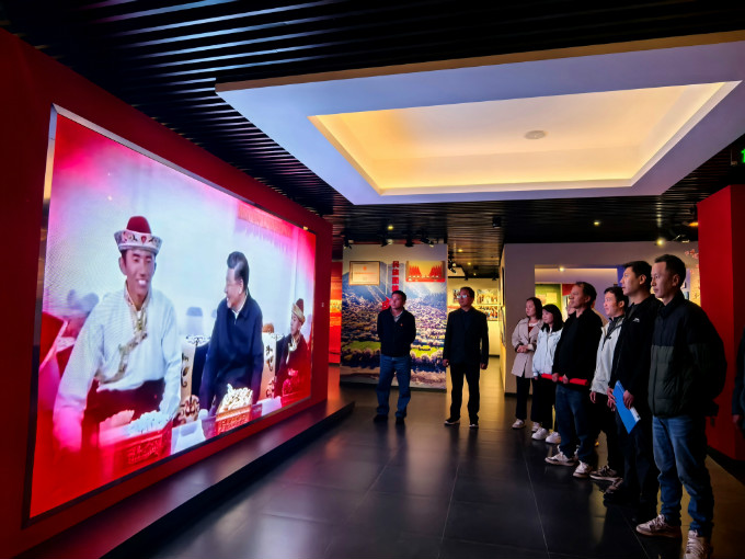 活動中,大家觀摩了嘎拉村“團結頌”主題教育展覽館。展覽館以“團結頌、振興頌、英雄頌、解放頌”四大主題展區(qū),通過一幅幅歷史照片和詳實的發(fā)展歷程展示,生動呈現(xiàn)了嘎拉村在黨的堅強領導下,各族群眾團結奮斗,實現(xiàn)美麗鄉(xiāng)村建設的巨大變化。同時,黨支部依托展覽館黨員初心學堂電子平臺,開展黨建知識競賽,黨支部書記喬次仁圍繞總書記重要回信精神講黨課。